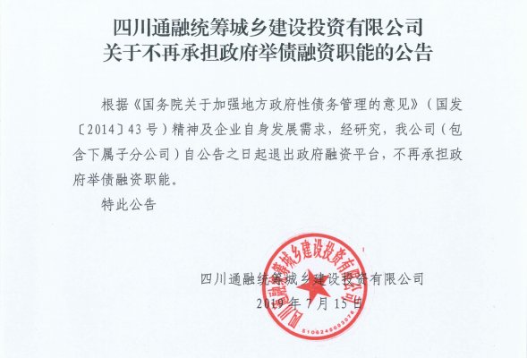 根據(jù)《國務院關于加強地方政府性債務管理的意見》(國發(fā)〔2014〕43號)精神及企業(yè)自身發(fā)展需求,經研究,我公司(包含下屬子分公司)自公告之日起退出政府融資平臺,不再承擔政府舉債融資職能。特此公告四川通融統(tǒng)籌城鄉(xiāng)建設投資有限公司2019年7月…